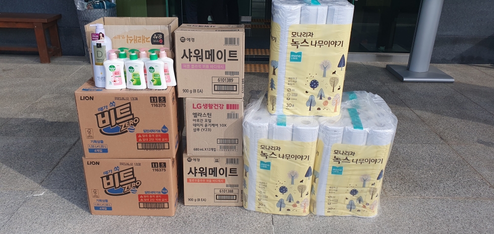 광주 북구(을) 지역위원회에서 입주민을 위해 샴푸 1BOX, 세제 1BOX, 핸드워시 1BOX, 바디워시 1BOX를 후원해 주셨습니다.