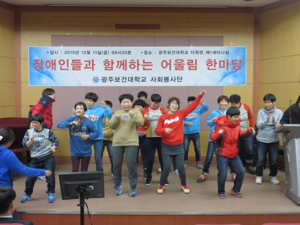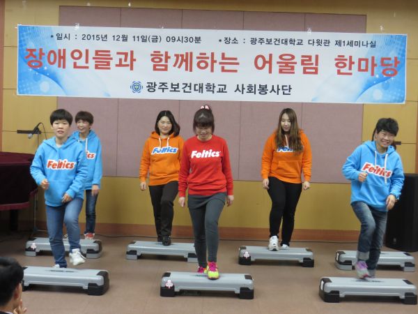광주보건대학교 사회봉사단에서 주최하는 어울림 한마당에 이용자분들과 함께 참여하였습니다. 공연으로는 이용자분들과 교사가 함께하는 스텝박스를 멋지게 선보였으며 장기자랑으로는 음악에 맞춰 신나는 댄스를 추었습니다. 모두들 즐겁게 축제를 즐기신 후 맛있는 점심식사를 대접받고 돌아왔습니다.^^