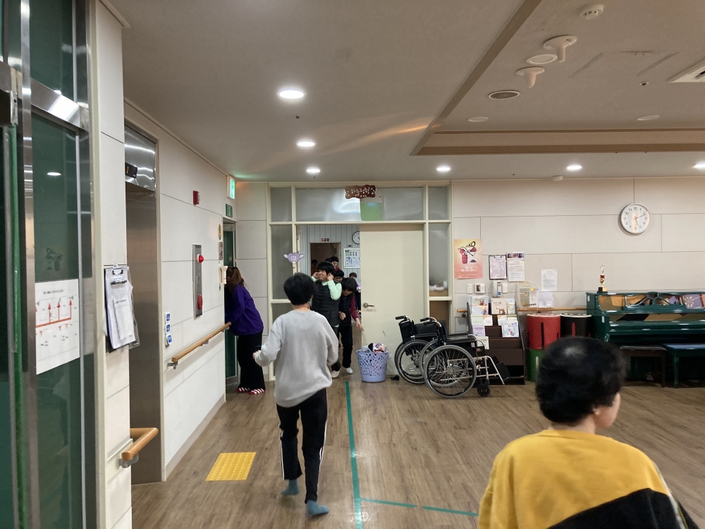 반복적인 훈련으로 이제는 사이렌이 울리자 고민하지 않고 건물 밖 안전지대로 대피하는 모습을 보여줍니다.