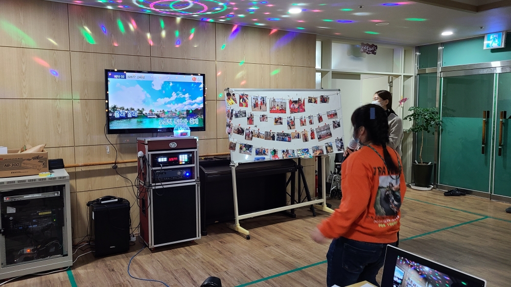 각 홈에서 강당의 상황을 이원생중계 하니 TV에 입주민이 나오자 너무 좋아하셨습니다.