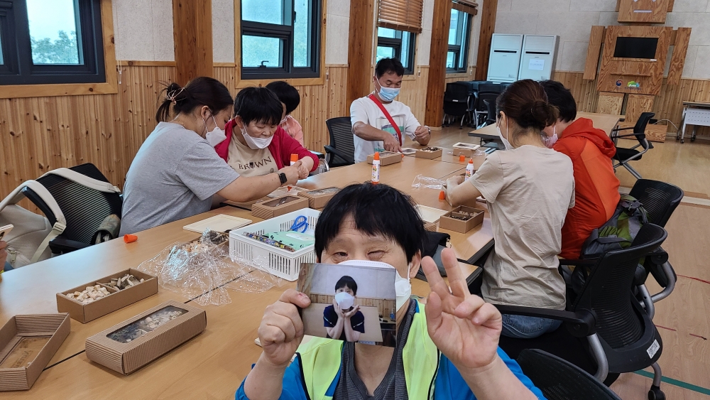 일어나서 이부자리를 정리하고 강당에 모여 추억을 담은 나무액자를 만들었습니다.